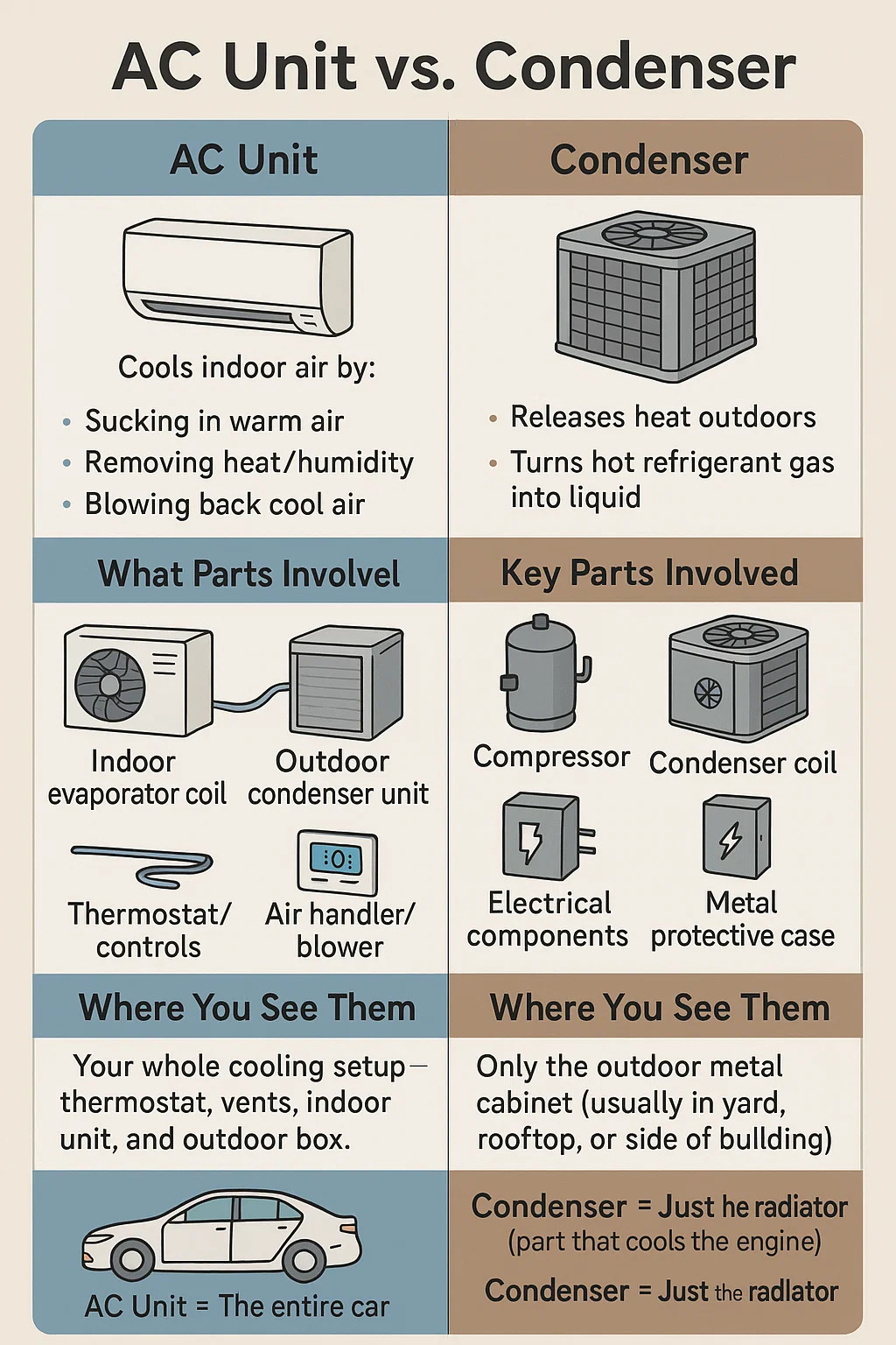Hic manifesta differentia est inter condicionem aeris (AC unit) et a condenser :